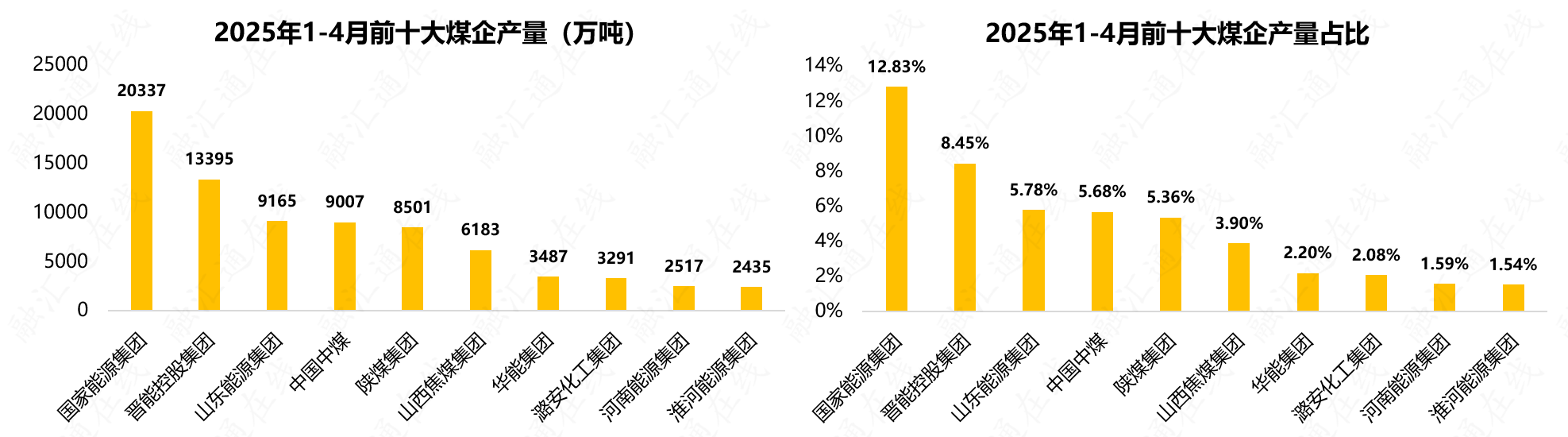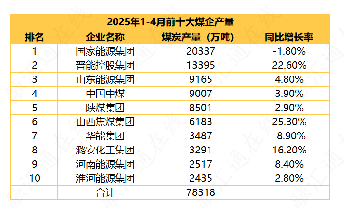 据中国煤炭工业协会统计与信息部统计,排名前10家企业原煤产量合计为7.8亿吨,同比增加4727万吨,占规模以上企业原煤产量的49.4%。具体情况为:国家能源集团20337万吨,同比下降1.8%;晋能控股集团13395万吨,同比增长22.6%;山东能源集团9165万吨,同比增长4.8%;中国中煤9007万吨,同比增长3.9%;陕煤集团8501万吨,同比增长2.9%;山西焦煤集团6183万吨,同比增长25.3%;华能集团3487万吨,同比下降8.9%;潞安化工集团3291万吨,同比增长16.2%;河南能源集团2517万吨,同比增长8.4%;淮河能源集团2435万吨,同比增长2.8%。