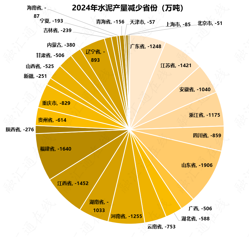其中,山东省的水泥产量减产量最大,达到了1906万吨,显著高于其他省份。紧随其后的是福建省,减产1640万吨,降幅高达20.41%。第三位是江西省,减产1452万吨,降幅为17.41%。