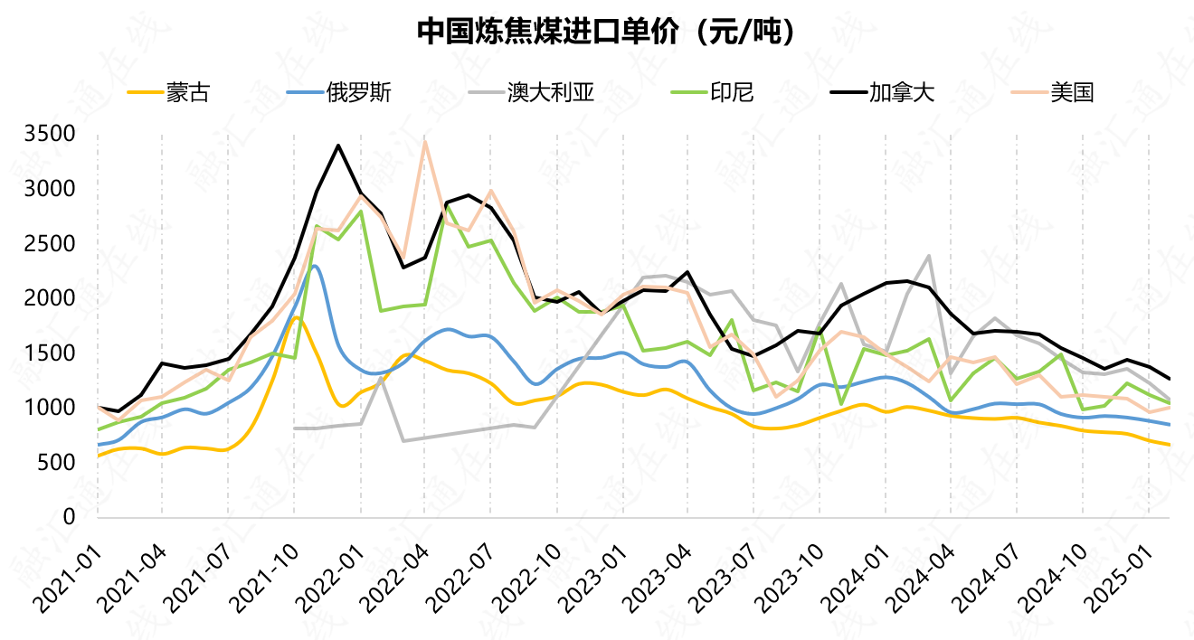 另一方面,国内炼焦煤价格也持续下行。以山西临汾安泽主焦为例,截至2025年4月9日,其出厂含税价为1330元/吨,较2024年初下降了1270元/吨,降幅高达48.9%。作为国内炼焦煤的补充,进口炼焦煤也被动跟跌。