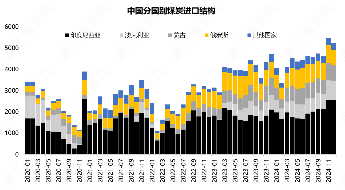 分国别来看,2024年12月,印度尼西亚是中国最大的煤炭进口来源国,进口量为2554.53万吨,占比49%。澳大利亚是第二大煤炭进口来源国,进口量为909.20万吨,占比17%。蒙古是第三大煤炭进口来源国,进口量为759.00万吨,占比15%。俄罗斯是第四大煤炭进口来源国,进口量为709.57万吨,占比14%。美国和加拿大进口量分别为103.68万吨和101.46万吨,均占2%;菲律宾进口量为65.44万吨,占比1%。莫桑比克进口量17.58万吨;吉尔吉斯斯坦进口量1.38万吨;哈萨克斯坦进口量0.52万吨。