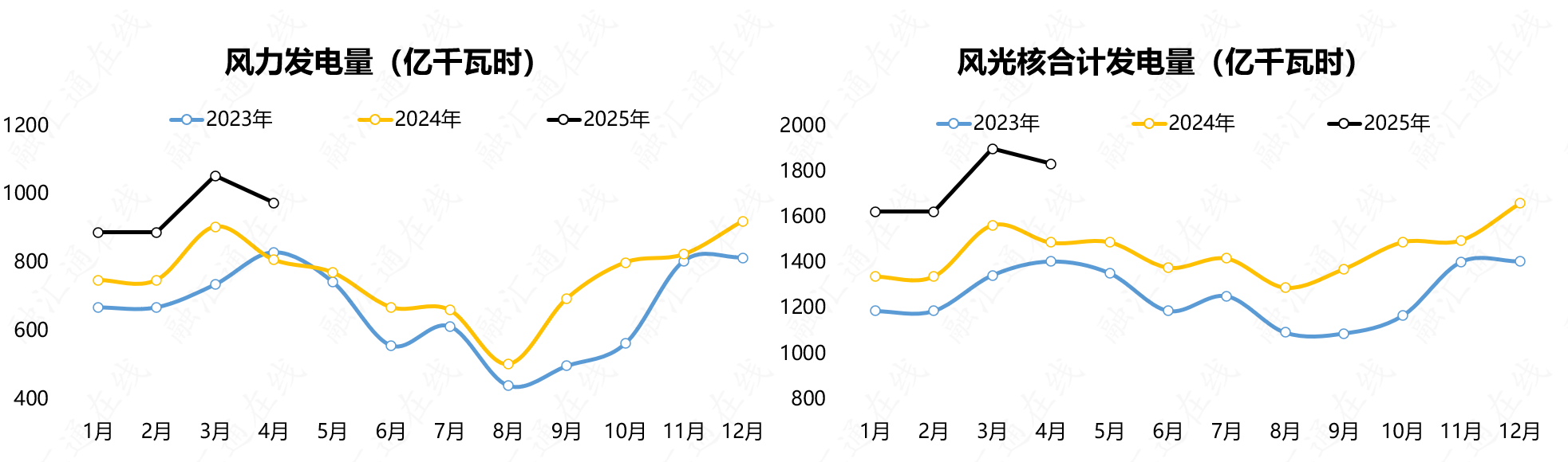 3.1、清洁能源发电增长情况:2025年4月,核电发电量为411亿千瓦时,同比增长12.4%;风力发电量为975亿千瓦时,同比增长12.7%;太阳能发电量为447亿千瓦时,同比增长16.7%。风光核合计发电量为1833亿千瓦时,同比增长23.2%。