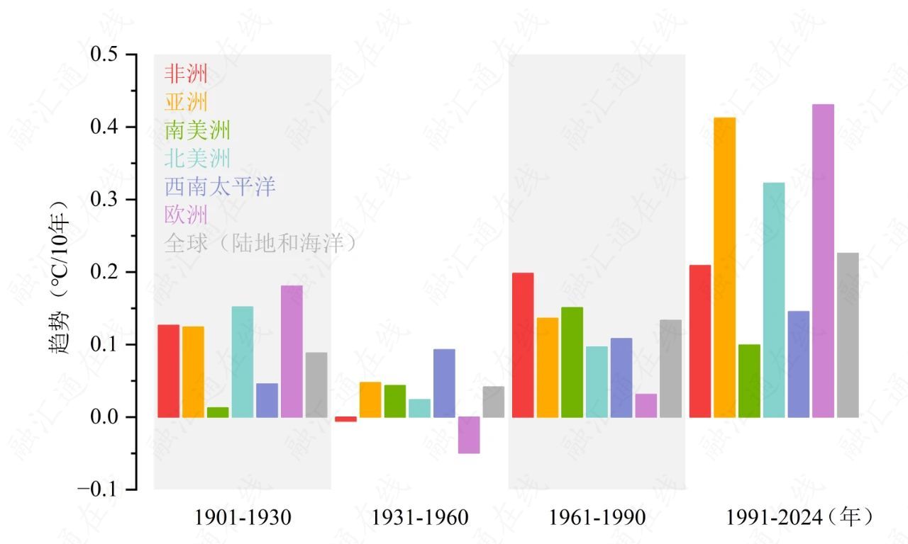 1991年以来,欧洲、亚洲和北美洲地区表面平均温度呈显著的上升趋势,其变暖速率明显超过同期全球平均水平,较上一个30年(1961-1990年)变暖速率分别增加0.40、0.28和0.23℃/10年。(图3)